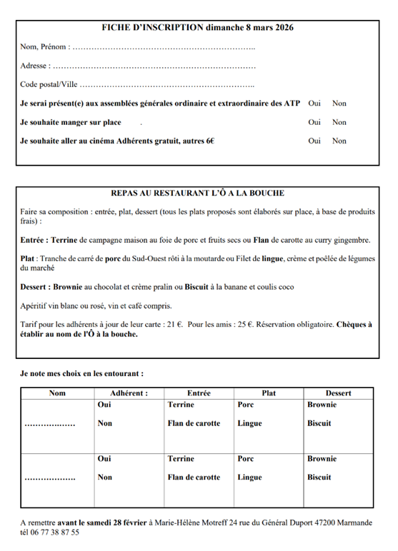Chèques à établir au nom de l'Ô à la bouche. A remettre avant le samedi 28 février à Marie-Hélène Motreff 24 rue du Général Duport 47200 Marmande, tél 06 77 38 87 55. Ne pas oublier de préciser vos choix (entrée, plat, dessert). Fiche d'inscription
